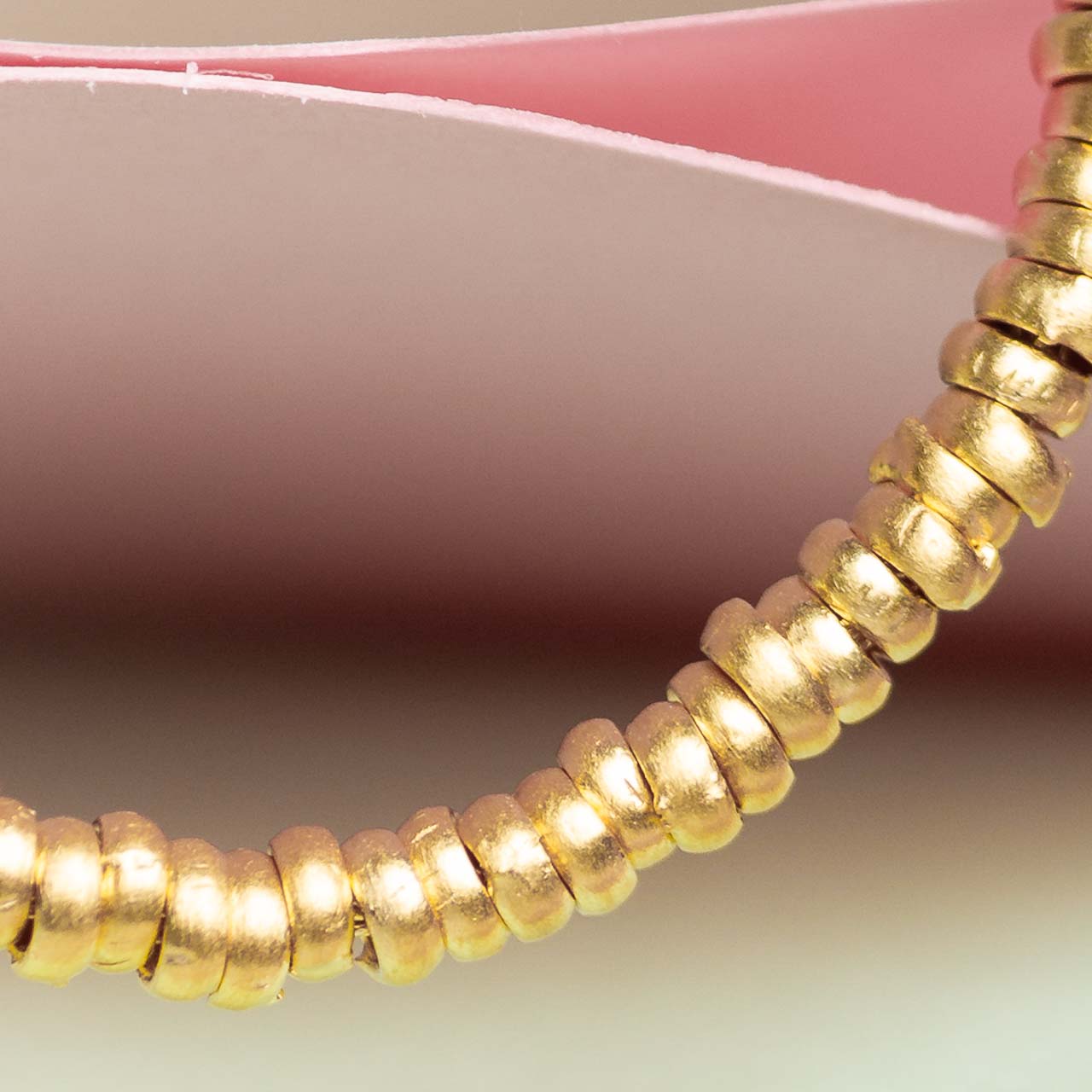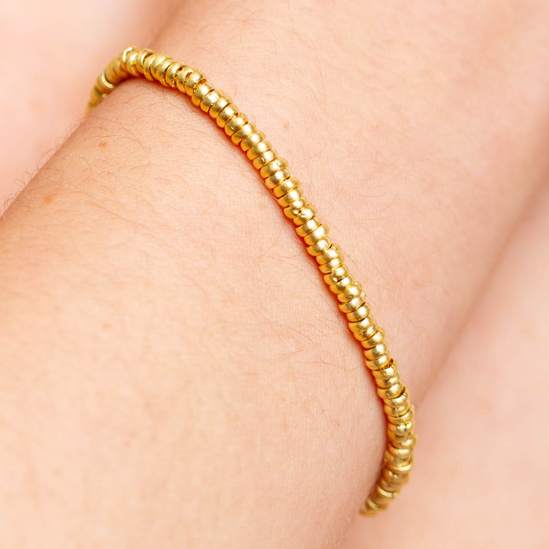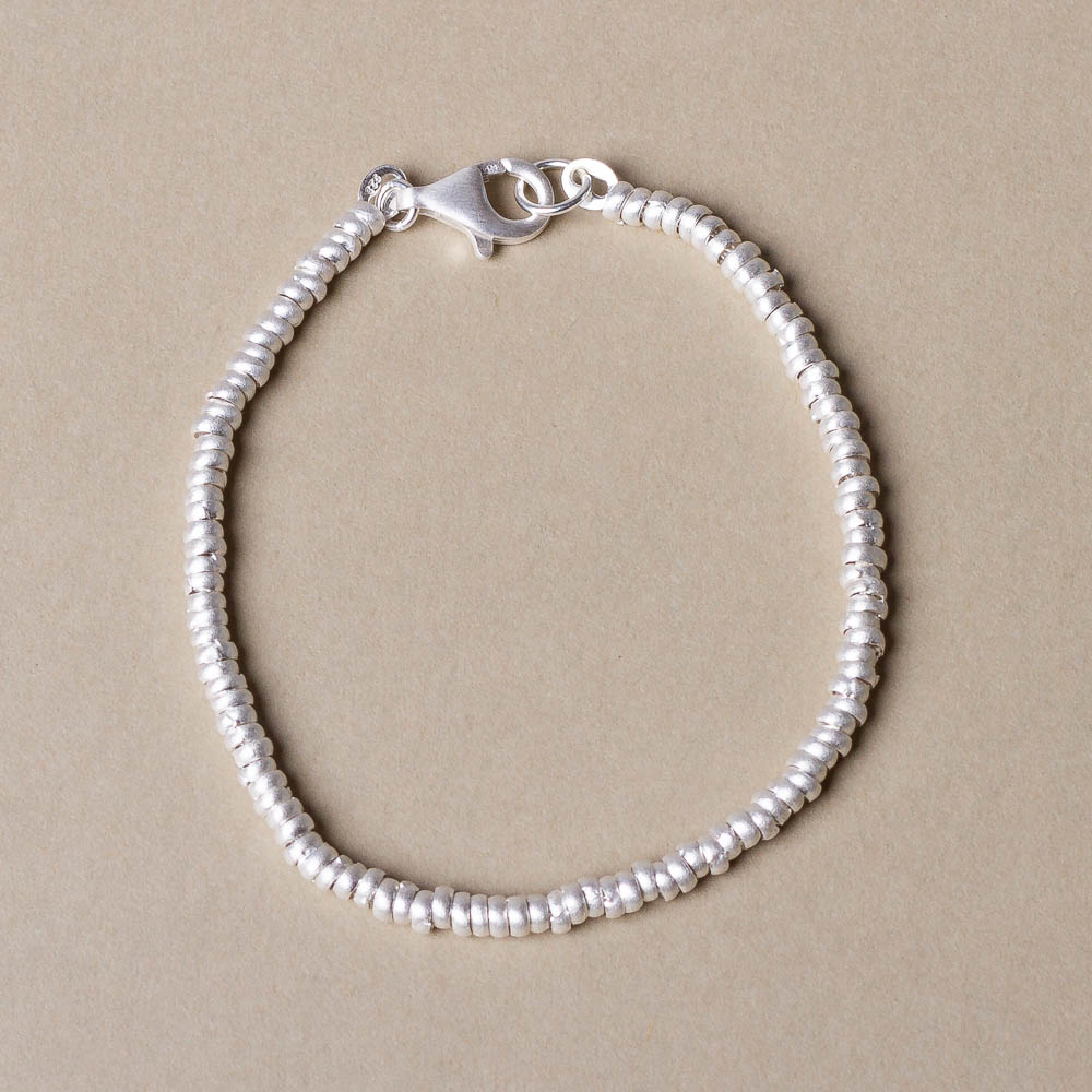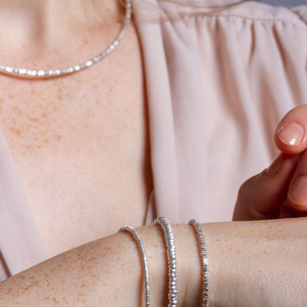 Die ungleichmäßigen Ringe, die dieses edle Armband ausmachen, reihen sich organisch auf einem flexiblen Edelstahlband aneinander. Der Durchmesser des Armbands beträgt ca. 3,2 mm und es ist in verschiedenen Längen erhältlich.