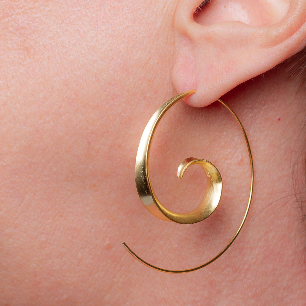 Creolen im Design der Spirale. Die schmaler werdende Spirale sorgt mit der mattierten Oberfläche für einen außerordentlichen Auftritt. Durch ihr innovatives Design gibt es keine Ösen oder Aufhänger, sie werden direkt durch das Ohrloch gefädelt und gegebenenfalls auf der Rückseite fixiert. Gewicht 3,3 Gramm. Durchmesser ca. 4 cm.