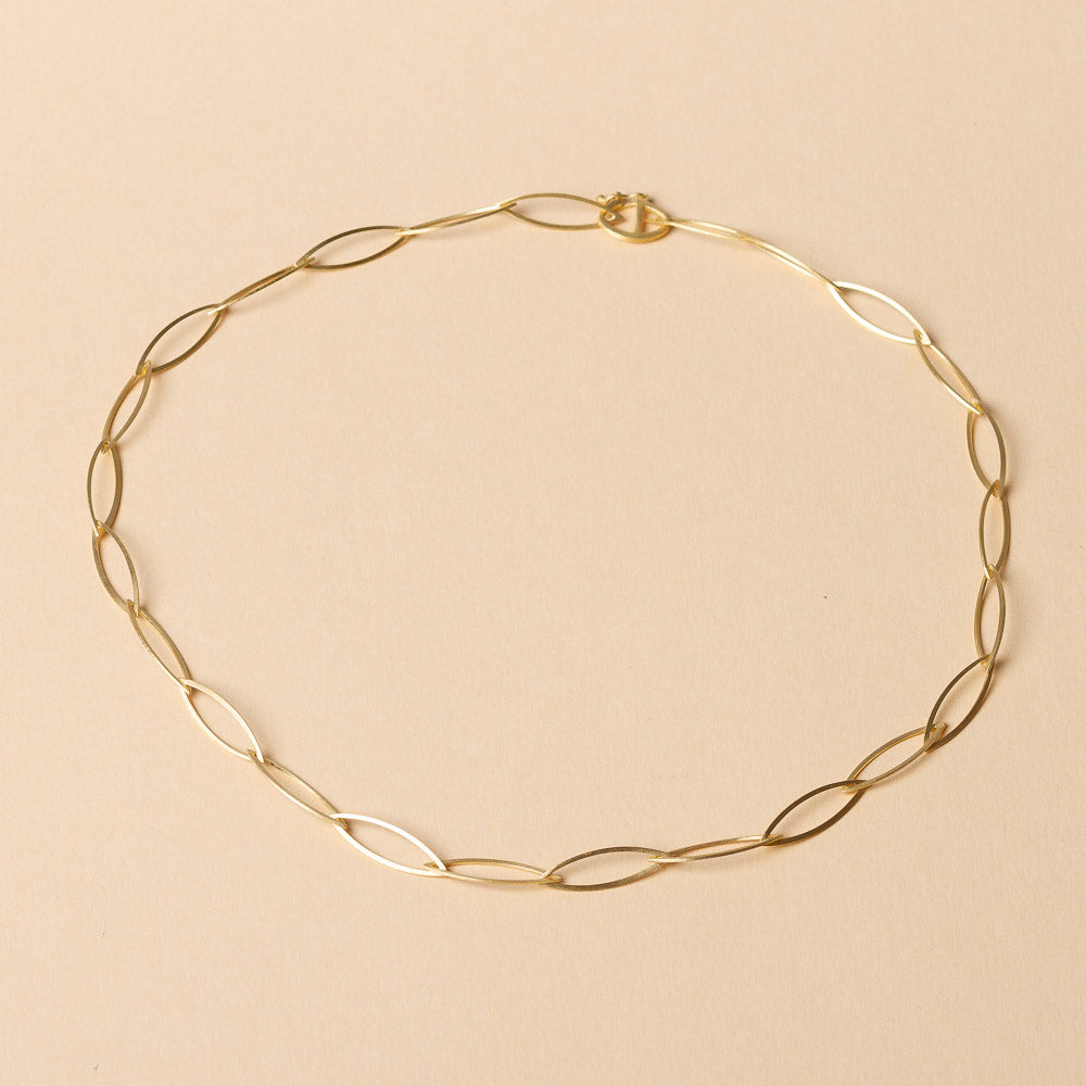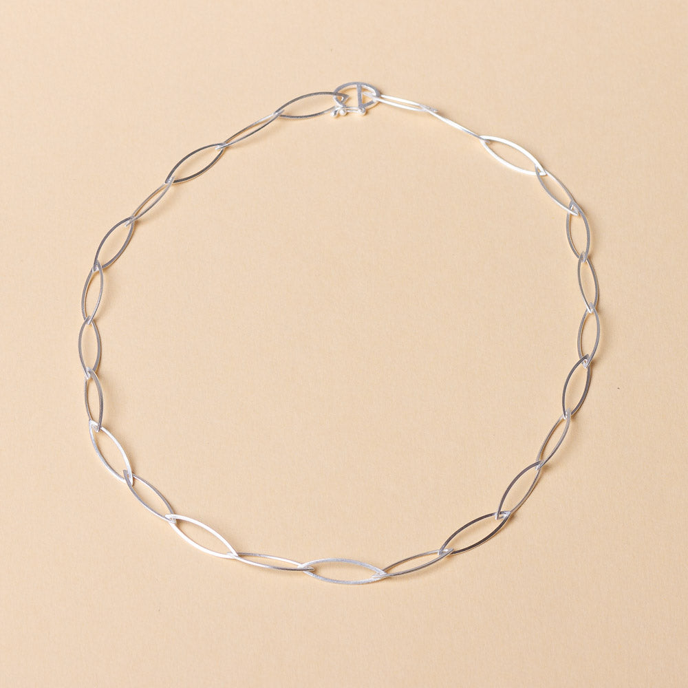 Diese feine Gliederkette besticht durch ihre zarten, navetteförmigen Elemente, die auf geschickte Weise federleicht und zugleich elegant wirken. Die einzelnen Elemente der Kette sind 10 mm lang und 6 mm breit. Die mattierte Oberfläche verleiht ihr eine dezente, aber edle Ausstrahlung. In 925 Silber oder 925 Silber gold plattiert erhältlich, ist diese Kette ein perfektes Accessoire für jeden Tag oder einen besonderen Anlass.
