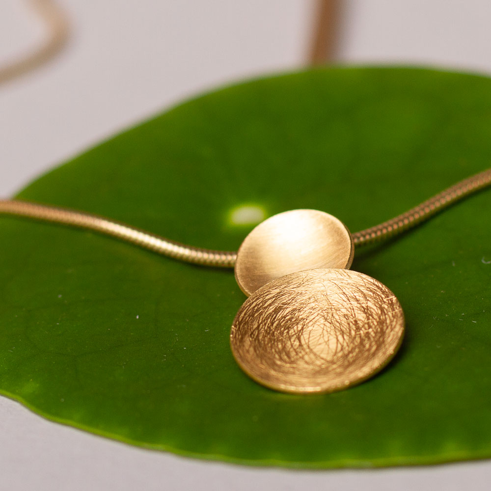 Kettenanhänger in 585 Gelbgold. Zwei Plättchen, ein kleines und ein etwas größeres, schmiegen sich aneinander und erinnern uns an einen Sonnenaufgang. Strahlend und immer wieder schön und golden!