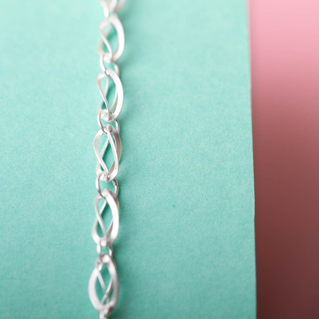 Die Halskette „Leicht & Luftig“ begeistert mit fein gearbeiteten, phantasievoll verschlungenen Kettengliedern. Die matte Oberfläche verleiht ihr eine dezente Eleganz, während die Leichtigkeit für ein spürbares, aber nicht beschwerendes Tragegefühl sorgt. Der Durchmesser der Kette ist ca. 5 mm.