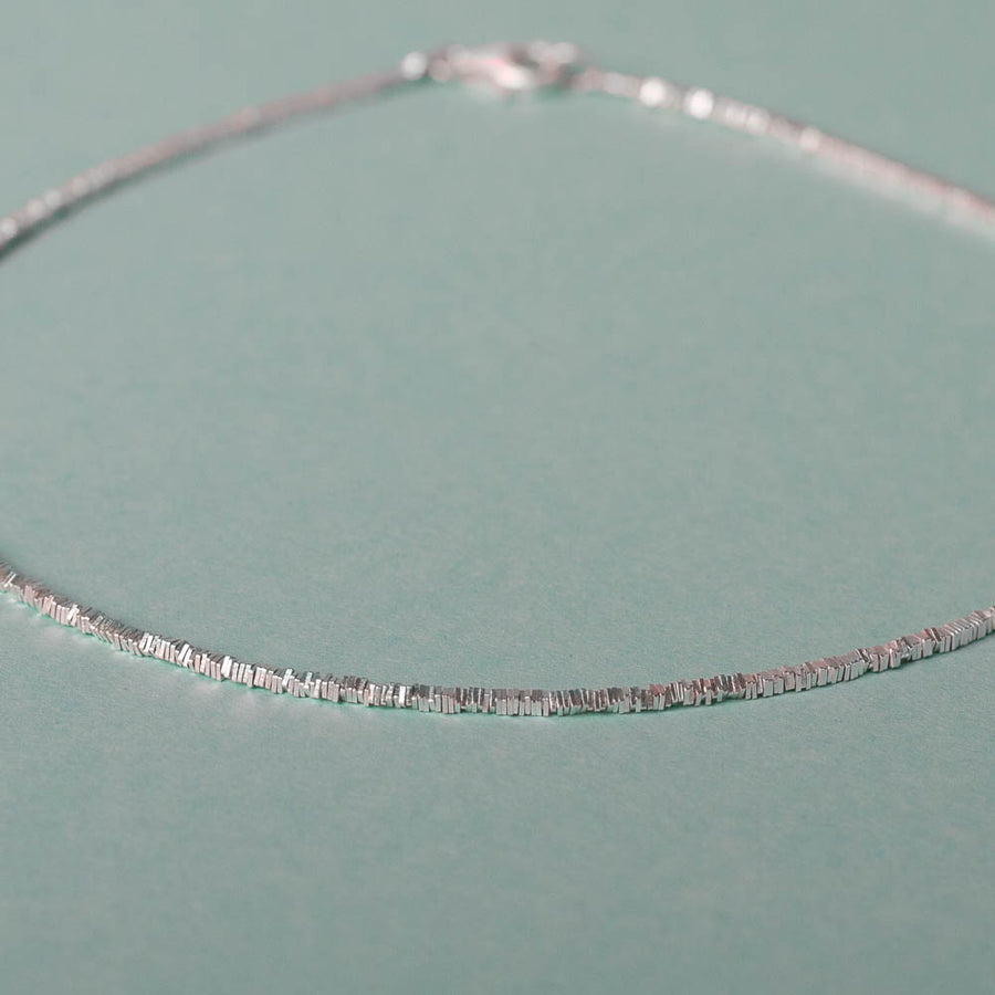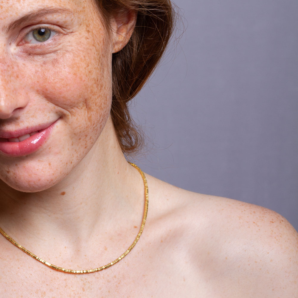 Halskette Quadrat Fein – Feine Halskette, bei der quadratische Plättchen aneinandergereiht eine interessante Wirkung entfalten. Ideal für jeden Tag – aber nie alltäglich. Eine Halskette, die minimalistisch wirkt und dennoch Eindruck hinterlässt. Dieses Collier hat einen Kettendurchmesser von ca. 1,9 mm und ist auf Anfrage auch in anderen Längen erhältlich.