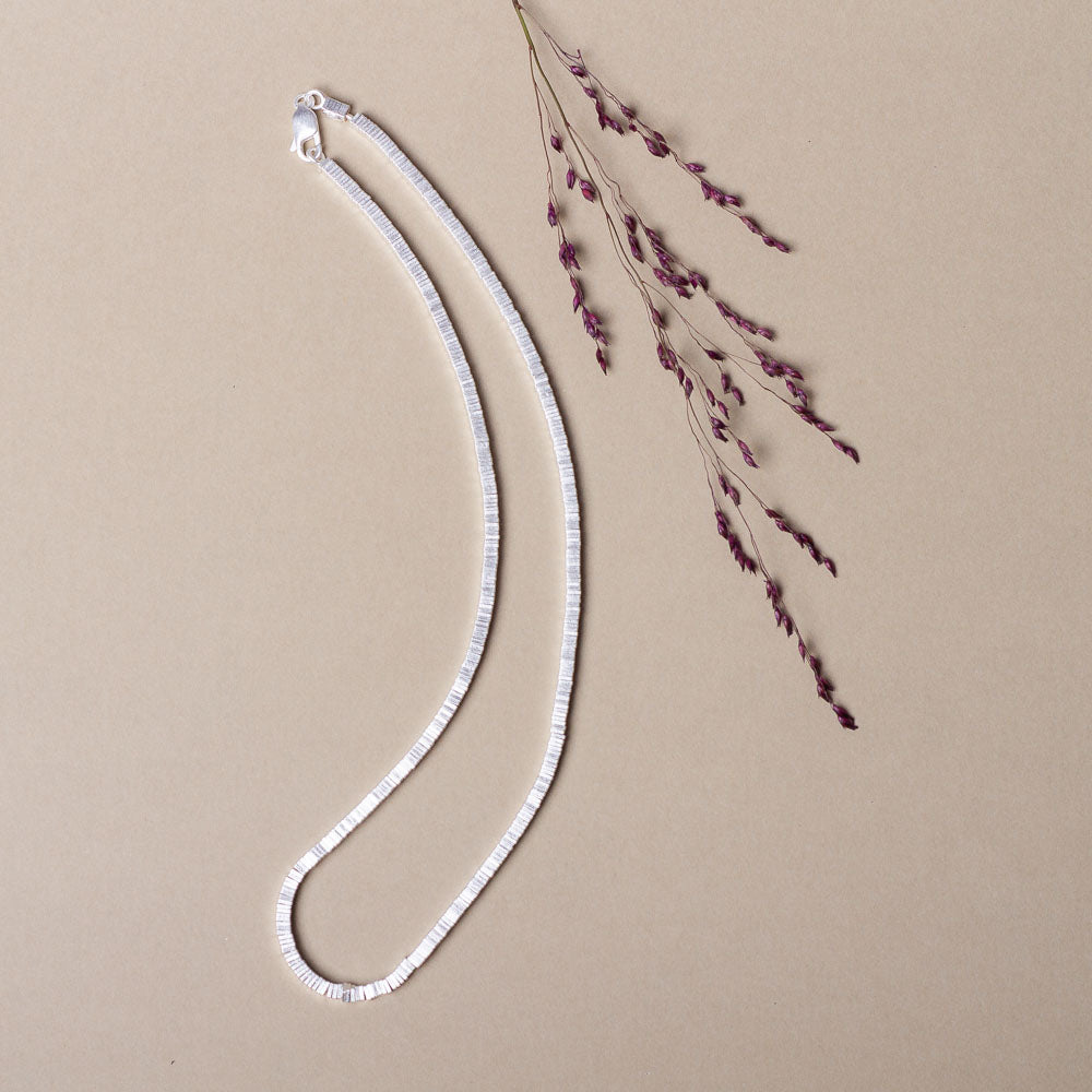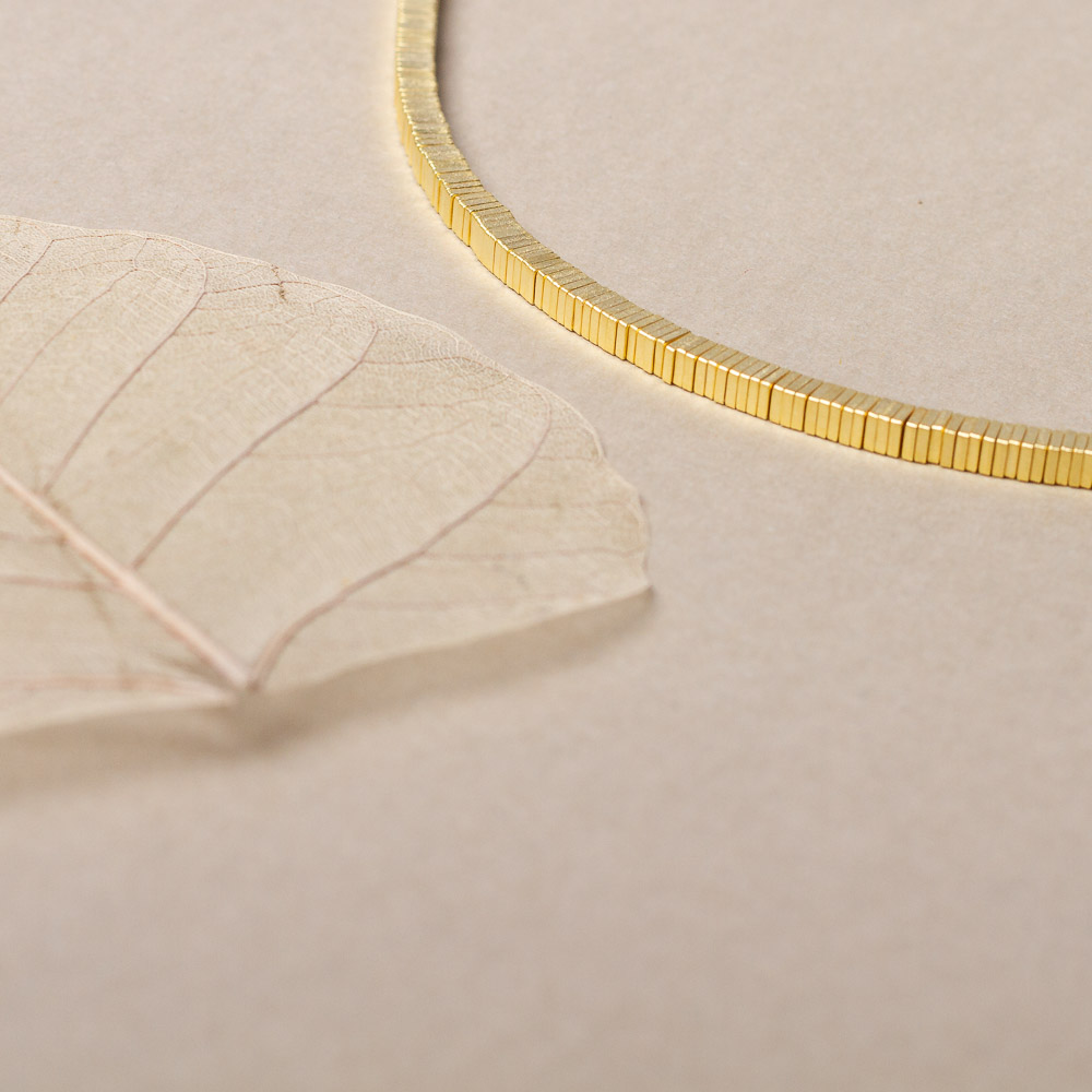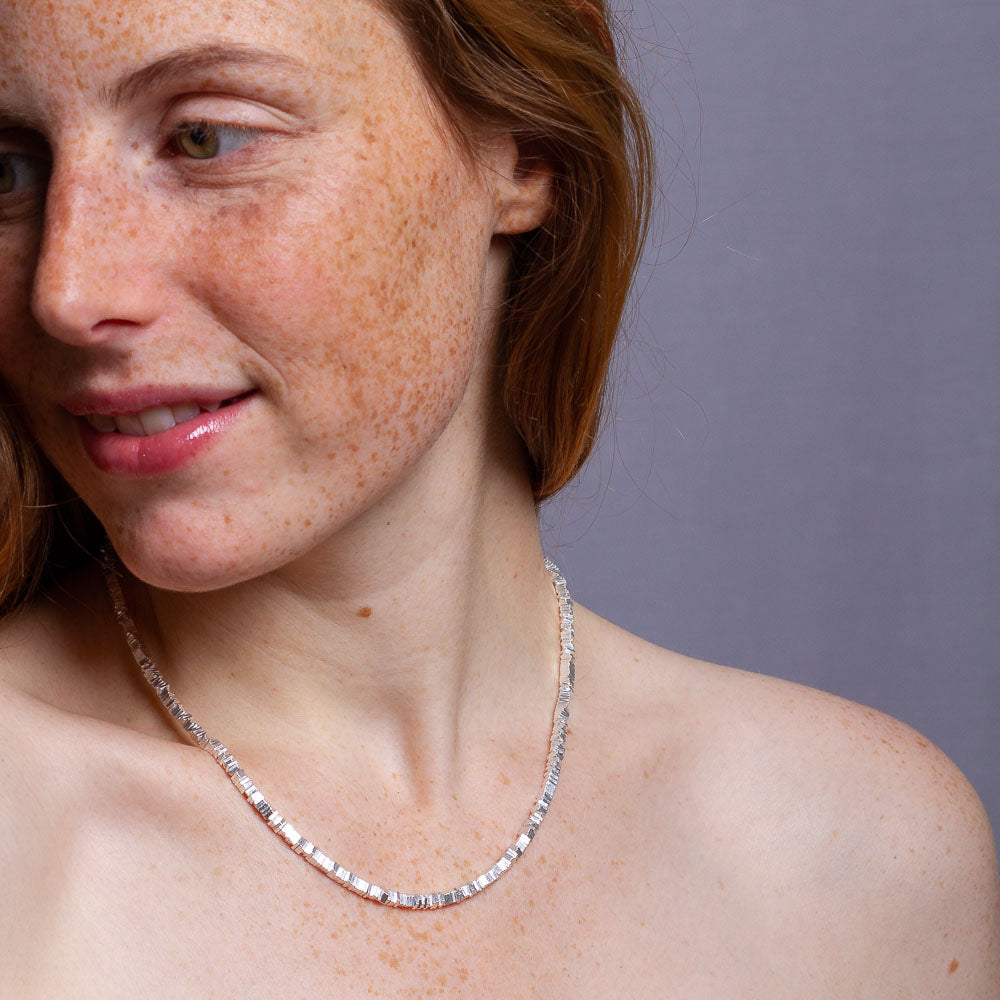 Halskette Quadrat – gradlinig und geometrisch verspielt mit Glanzmomenten. Dieser Halsschmuck hat Ecken und Kanten und genau das macht seinen Charme aus. Quadratische Scheibchen reihen sich aneinander, leicht gegeneinander verdreht, sodass sie bei jeder Bewegung ein neues Lichtspiel zaubern. Mal dezent, mal auffällig – je nachdem, wie das Sonnenlicht sie trifft. Die Kantenlänge der Quadrate beträgt ca. 3 mm. Eine besondere Kette in Silber oder Gold mit moderner Note, die auch solo stark wirkt. Für alle, die klare Formen lieben und kleine Details schätzen.