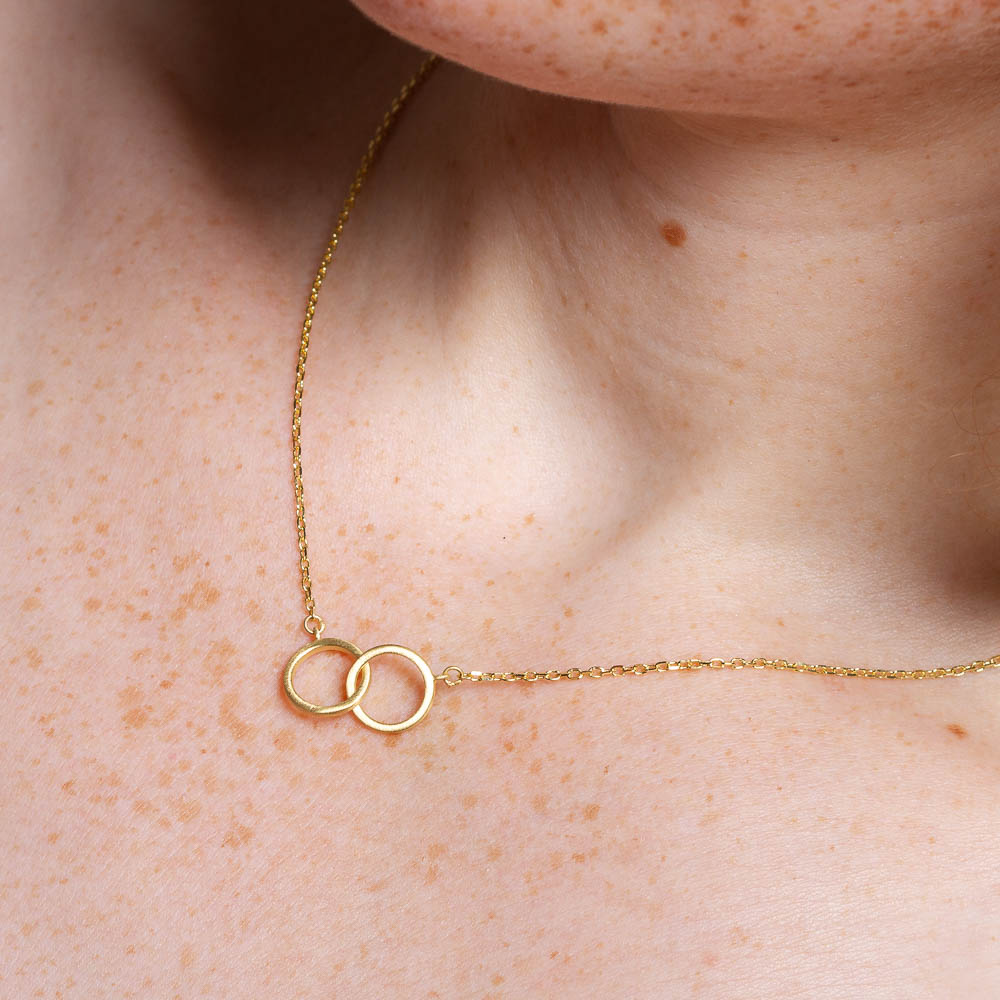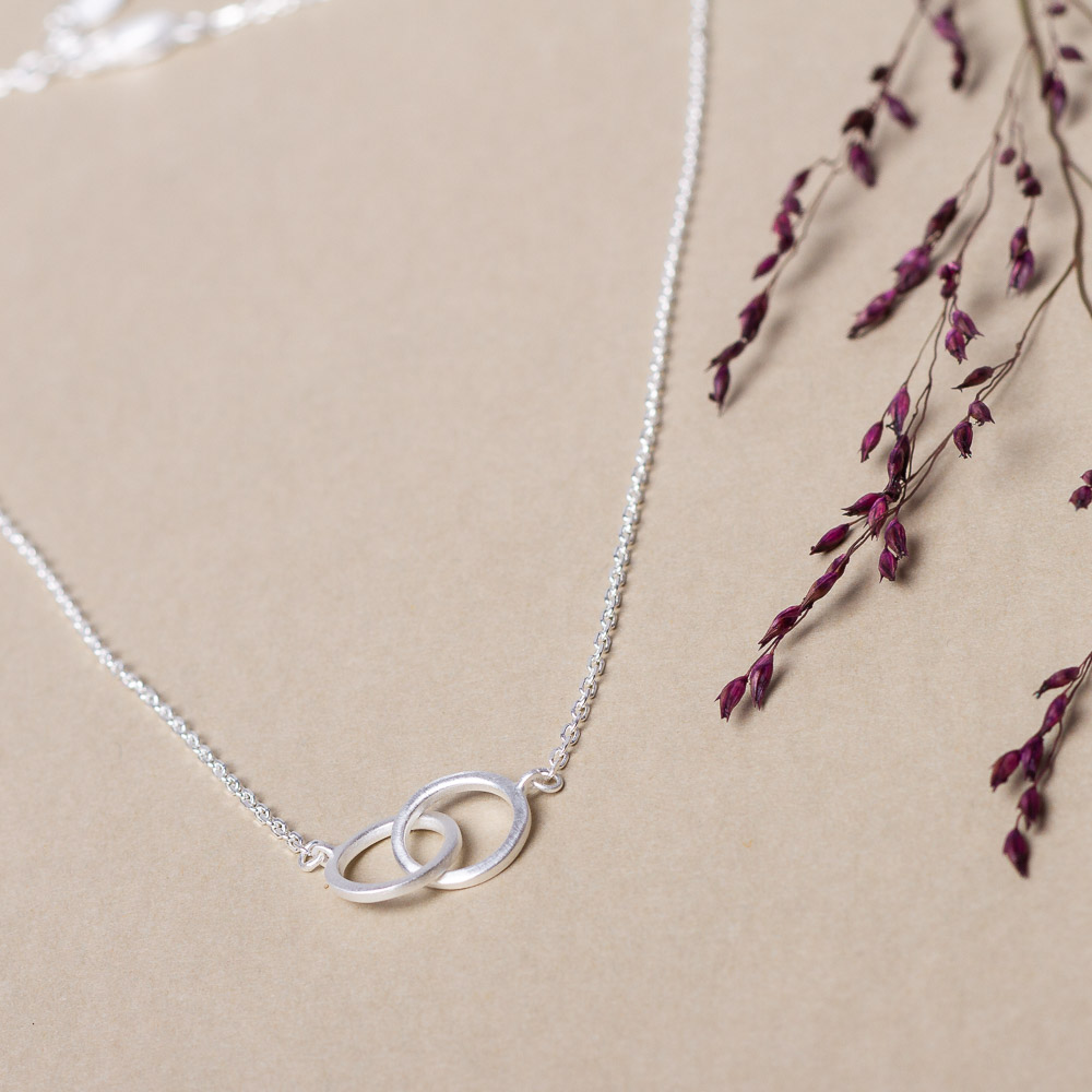 Halskette „Verbundenheit“ – zwei Ringe, ein Gefühl. Zwei Ringe, spielerisch ineinander verschlungen – ein zartes Symbol für Nähe, Vertrauen und alles was uns verbindet. Die Halskette „Verbundenheit“ ist ein feines Statement für besondere Beziehungen – ob zu dir selbst oder zu einem lieben Menschen.