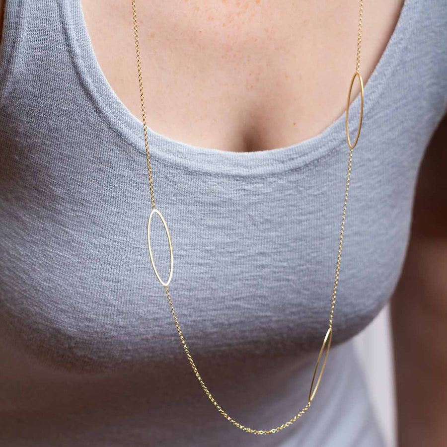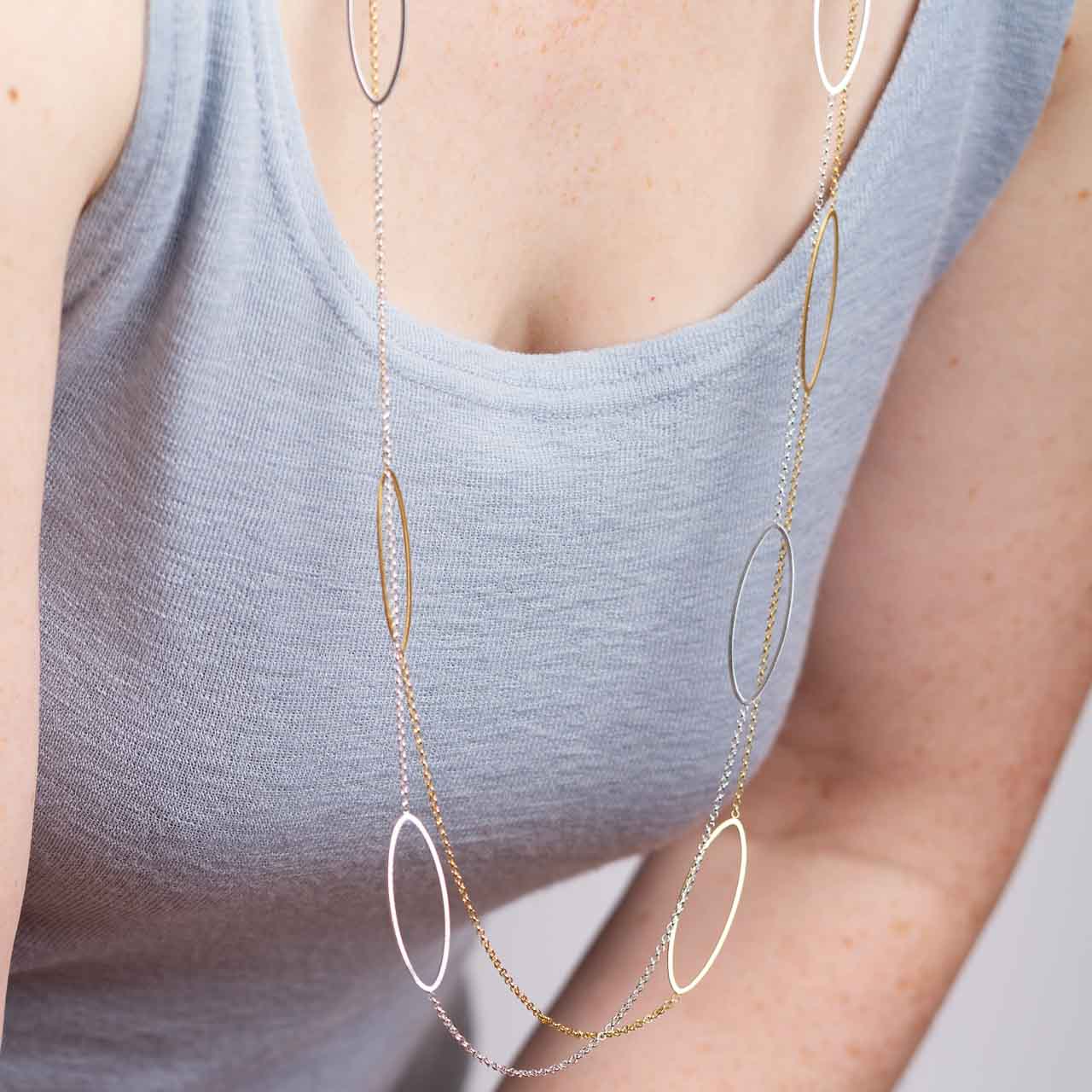 Schlicht, edel und doch voller Ausdruck: Die Ovalis-Kette verbindet filigrane Leichtigkeit mit markanter Form. Die feinen ovalen Ringe, harmonisch in die lange Halskette eingearbeitet, schaffen eine flieĂźende Dynamik und der Schmuck setzt dezente, aber wirkungsvolle Akzente. Die ovalen Elemente dieser Halskette haben MaĂźe von ca. 4 x 1,2 cm.