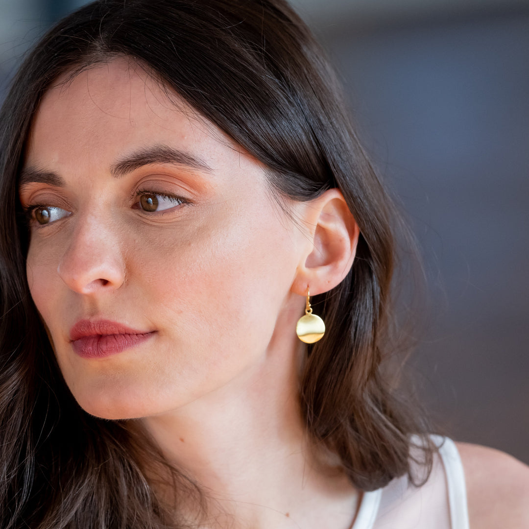 Minimalistischer, runder Ohrhänger mit einer leicht gewellten Oberfläche. Dieser goldene Ohrschmuck ist die kleine Schwester von unserem größeren Silberohrhänger Welle. Ein schönes Basicschmuckstück, für alle die gern kleinen Ohrschmuck haben oder die sich vorsichtig an die hängende Form des Ohrschmucks herantasten möchten. Die Ohrhänger bestehen aus 925 Silber vergoldet, die Vorderseite ist feinmatt und die Rückseite ist poliert. Sie sind ganz leicht, ein Ohrhänger wiegt nur 1,7 g.