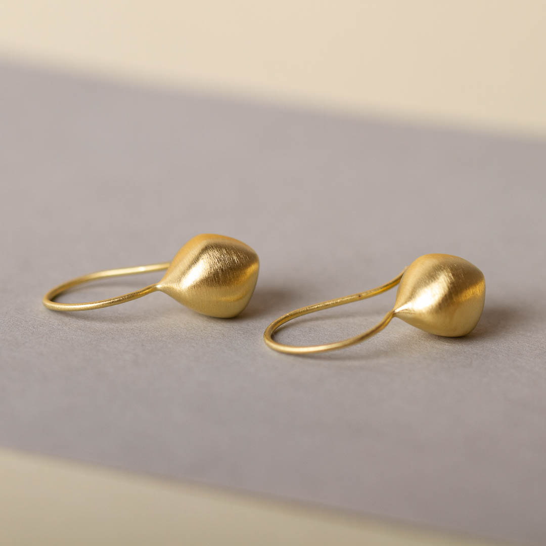 Ohrring Kleiner Tropfen – zart, schlicht, fein. Ein kleiner Tropfen für große Wirkung. Tropfenohrring mit feinmatter Oberfläche. Dieses Modell ist etwas kleiner als das Modell „Ohrring Großer Tropfen“ und eignet sich für alle die eher kleine Ohrhänger mögen. Die Oberfläche ist feinmatt gebürstet und bringt das Metall ganz sanft zum Leuchten. Erhältlich als Silberohrhänger oder als Goldohrhänger.