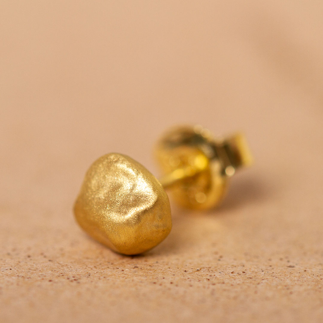 Goldene Ohrstecker in der Form eines massiven Goldnuggets. Verfügbar in Silber Gold plattiert oder in dem hochwertigen 585 Gelbgold. Oberfläche feinmatt. Durchmesser ca. 6,5mm.