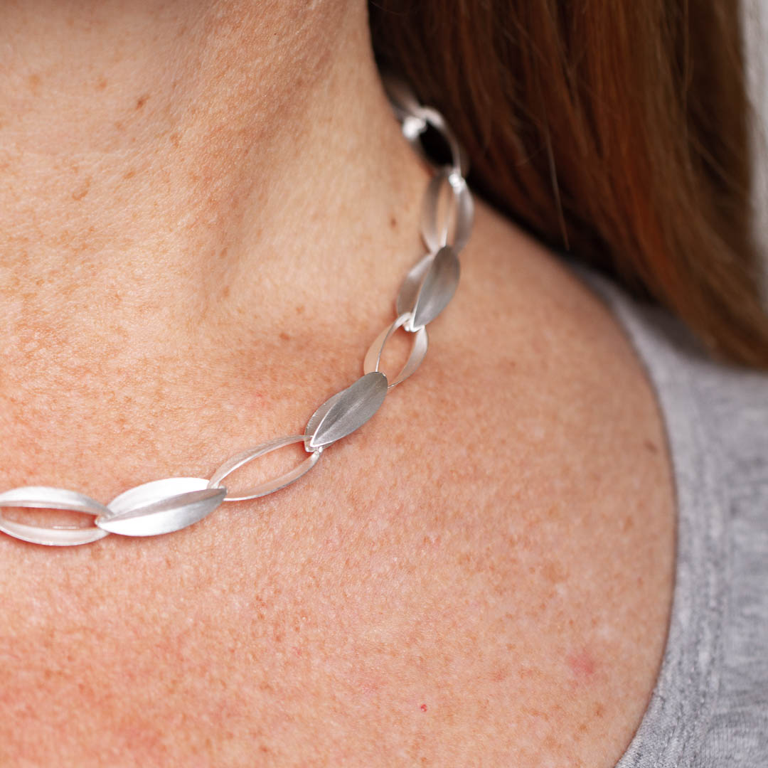 Elegantes Silbercollier mit ausgefallenen einzelnen Silberelementen.