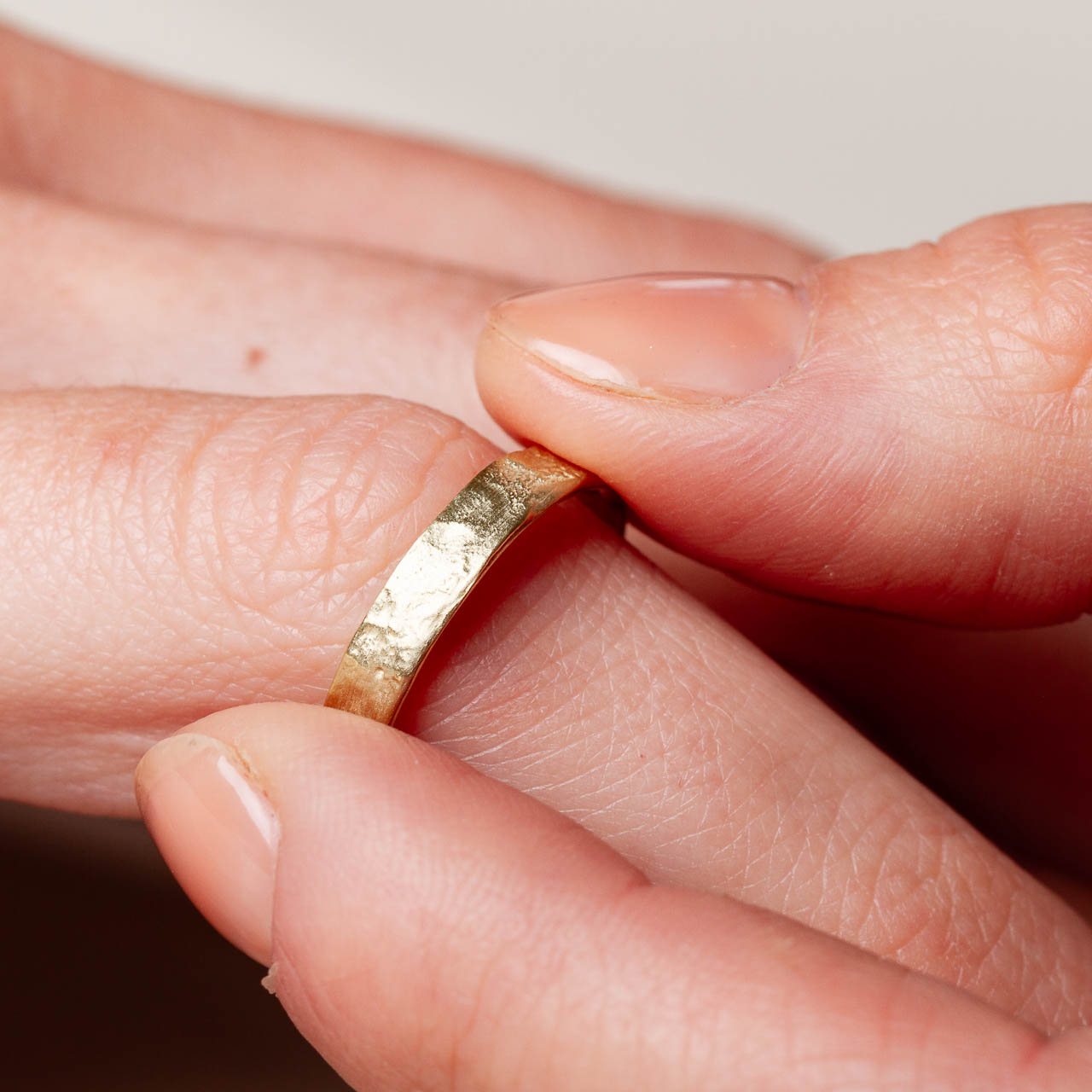 Diese goldenen Trauringe haben eine besondere und ungewöhnliche Oberfläche. Wir haben mit einer Flamme gearbeitet und heraus kam dieses zarte Ringmodell für alle die es nicht so glatt und gerade mögen. In Silber oder Gold erhältlich.